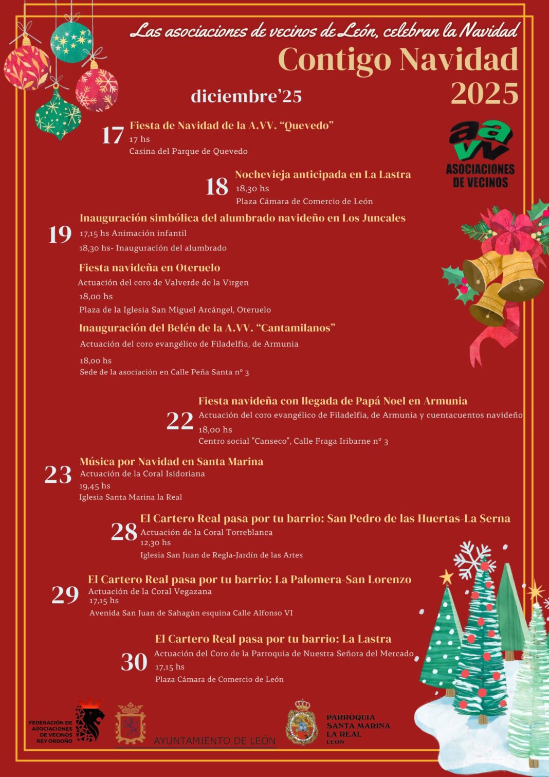 Las asociaciones vecinales celebran la Navidad animando nuestros barrios gracias a la colaboración del Ayuntamiento de León, la federación de AA.VV. de León «Rey Ordoño» y diversas entidades -Real Hermandad de Jesús Divino Obrero y cofradías del Santo Cristo del Perdón y Santo Cristo del Desenclavo- y firmas comerciales, como el restaurante Boccalino.