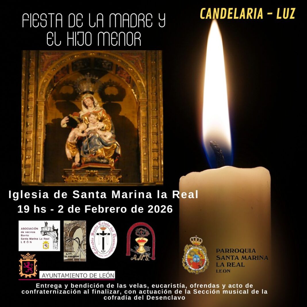 El LUNES 2 DE FEBRERO DE 2026 las asociaciones vecinales «Santa Marina la Real» y «El Espolón» celebrarán como es tradicional la Fiesta de las Candelas, a las 19 hs, en la Parroquia Santa Marina la Real de León, junto a otras entidades del barrio como son las cofradías del Santo Cristo del Desenclavo y la Agonía de Nuestro Señor y la colaboración del Ayuntamiento De León España.