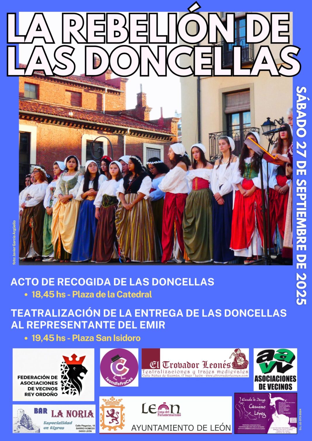 Las actividades dan comienzo durante la mañana del SÁBADO 27 de SEPTIEMBRE, donde los Heraldos Mensajeros recorrerán distintas calles y plazas del casco antiguo de León anunciando la entrega de las 100 doncellas según el tributo, en un edicto del rey Ramiro. Desde las 12 hs con salida de la Plaza San Isidoro.