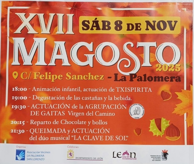 Animación infantil con «Txispirita», música tradicional con la agrupación de gaitas de La Virgen del Camino, degustación de castañas, chocolate y bollos formarán el grueso del programa lúdico para el día. El broche final será con una queimada y la actuación musical del dúo «La clave de Sol», incluida dentro del programa «Equinoccio de Otoño», que organiza la federación de AA.VV. de León «Rey Ordoño».